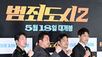 [OSEN=김성락 기자] 11일 오후 서울 삼성동 메가박스 코엑스에서 영화 ‘범죄도시2’ 글로벌 프레스 컨버런스가 열렸다.배우 박지환, 마동석, 이상용 감독, 최귀화가 취재진을 향해 포즈를 취하고 있다. 2022.05.11 /ksl0919@osen.co