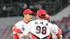 [OSEN=광주, 이대선 기자] 12일 오후 광주-기아챔피언스필드에서 '2022 신한은행 SOL KBO 리그' KIA 타이거즈와 KT 위즈의 경기가 열렸다.6회초 1사 1,2루에서 마운드를 방문한 KIA 서재응 코치가 한승혁, 박병호와 이야기를 나누고 있다.