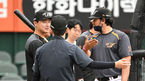 [OSEN=대전, 이대선 기자] 13일 오후 대전 한화생명이글스파크에서 '2022 신한은행 SOL KBO 리그' 한화 이글스와 롯데 자이언츠의 경기가 열렸다.경기에 앞서 롯데 서튼 감독이 한화 케네디 코치와 이야기를 나누고 있다. 2022.05.13 /sund