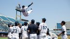 [OSEN=부산, 이석우 기자] 18일 부산 사직구장에서 ‘2022 신한은행 SOL KBO리그’ 롯데 자이언츠와 KIA 타이거즈 의 경기가 열렸다.롯데 자이언츠 이대호가 1회말 KIA 타이거즈 이우성을 3루 땅볼로 잡고 3루주자 황대인도 잡은