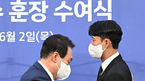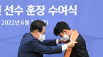 [OSEN=서울월드컵경기장, 이대선 기자] 2일 오후 서울 마포구 상암동 서울월드컵경기장에서 대한민국과 브라질의 평가전이 진행됐다.경기에 앞서 윤석열 대통령이 손흥민에게 체육훈장 청룡장을 수여하고 있다. 2022.06.02 /sunday@ose