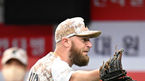 [OSEN=잠실, 지형준 기자] 8일 오후 서울 잠실구장에서 2022 신한은행 SOL KBO리그 두산 베어스와 한화 이글스의 경기가 열렸다.5회초 수비를 마친 두산 최원준이 2사에서 한화 하주석의 좌익수 플라이 타구를 처리한 김재환에 모자