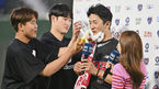 [OSEN=부산, 이석우 기자] 11일 부산 사직구장에서 ‘2022 신한은행 SOL KBO리그’ 롯데 자이언츠와 KT 위즈의 경기가 열렸다.KT 위즈 고영표가 롯데 자이언츠에 4-0 완봉승을 올리고 방송 인터뷰 도중, 소형준과 배제성의 축하를