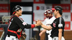 [OSEN=고척, 이대선 기자] LG가키움과 연장 접전에서천신만고 끝에 승리했다.LG는 17일 서울 고척스카이돔에서 열린 키움과의경기에서 연장 10회 4-2로 승리했다.경기 종료 후 LG 유강남과 고우석이 승리의 기쁨을 나누고 있다. 2022.0