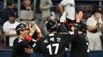 [OSEN=고척, 이대선 기자] 17일 오후 서울 고척스카이돔에서 2022 신한은행 SOL KBO리그 키움 히어로즈와 LG 트윈스의 경기가 열렸다.10회초 2사 1,3루에서 LG 김현수가 우월 스리런 홈런을 치고 홈에서 동료들과 환호하고 있다. 2022.06.17