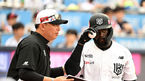 [OSEN=수원, 지형준 기자] 26일 오후 경기도 수원 KT위즈파크에서 ‘2022 신한은행 SOL KBO리그’ KT 위즈와 LG 트윈스의 경기가 열렸다.3회말 KT 알포드가 대기 타석에서 김강 코치와 이야기를 나누고 있다. 2022.06.26 /jpnews@osen.co.kr