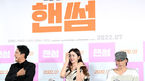 [OSEN=최규한 기자] 6일 오후 서울 자양동 롯데시네마 건대입구에서 영화 ‘핸썸’ (감독 김동욱) 언론시사회가 열렸다.배우 신현준, 박솔미, 김동욱 감독(왼쪽부터)가 취재진의 질문에 답하며 미소짓고 있다. 2022.07.06 / dreame