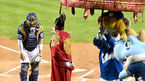 [OSEN=잠실, 이대선 기자] 16일 오후 서울 잠실야구장에서 2022 신한은행 SOL KBO 올스타전이 열렸다.2회말 드림올스타 김태군이 삼성 마스코트와 함께 올드 마스코트를 향해 절을 하고 있다. 2022.07.16 /sunday@osen.co.kr