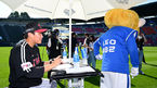 [OSEN=잠실, 조은정 기자] 15일 오후 서울 송파구 잠실야구장에서 '2022 신한은행 SOL KBO 올스타 프라이데이' 퓨처스 올스타 팬 사인회가 열렸다.LG 김영진이 삼성 마스코트에게 사인을 해주고 있다. 2022.07.15 /cej@osen.co.kr
