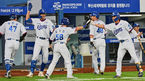 [OSEN=대구, 이석우 기자] 27일 대구 삼성라이온즈파크에서 ‘2022 신한은행 SOL KBO리그’ 삼성 라이온즈와 한화 이글스의 경기가 열렸다.삼성 라이온즈 강민호, 김재성, 김지찬이 5회말 1사 만루 김현준의 우전 3루타때 득점을