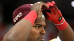 [OSEN=고척, 이대선 기자] 17일 오후 서울 고척스카이돔에서 2022 신한은행 SOL KBO리그 포스트시즌 준플레이오프 2차전 키움 히어로즈와 KT 위즈의 경기가 열렸다.경기에 앞서 키움 푸이그가 모자를 쓰고 있다. 2022.10.17 /sunday@osen.co.kr
