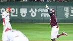 [OSEN=인천, 지형준 기자] 1일 오후 인천 SSG랜더스필드에서 ‘2022 KBO리그 포스트시즌 한국시리즈’ 1차전 SSG 랜더스와 키움 히어로즈의 경기가 열렸다.9회초 1사 2루에서 키움 전병우가 역전 투런포를 날리고 기뻐하고 있다.