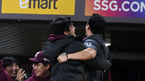 [OSEN=인천, 지형준 기자] 1일 오후 인천 SSG랜더스필드에서 ‘2022 KBO리그 포스트시즌 한국시리즈’ 1차전 SSG 랜더스와 키움 히어로즈의 경기가 열렸다.9회초 1사 2루에서 키움 전병우가 역전 투런포를 날리고 김태진과 기뻐