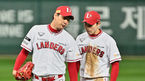 [OSEN=인천, 이석우 기자] 7일 인천 SSG 랜더스필드에서 ‘2022 신한은행 SOL KBO리그 한국시리즈’ SSG 랜더스와 키움 히어로즈의 5차전 경기가 열렸다.SSG 랜더스 김광현이 2회초 수비도중 박성한과 얘기를 하고 있다. 2022.11.07 /