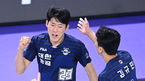 [OSEN=인천, 이대선 기자] 20일 오후 인천 계양체육관에서 도드람 2022~2023 V-리그 남자부 대한항공과 OK금융그룹의 경기가 열렸다.1세트 득점에 성공한 OK금융그룹 조재성이 환호하고 있다. 2022.11.20 /sunday@osen.co.kr