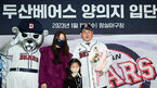 [OSEN=잠실, 조은정 기자] 11일 오후 서울 송파구 잠실구장에서 두산베어스 양의지의 입단식이 진행됐다.양의지는 지난해 11월 두산과 4+2년 최대 152억원, KBO리그 역대 최고 대우에FA 계약을 했다.두산 양의지가 아내와 딸과 함께 기
