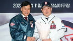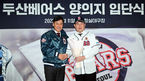 [OSEN=잠실, 조은정 기자] 11일 오후 서울 송파구 잠실구장에서 두산베어스 양의지의 입단식이 진행됐다.양의지는 지난해 11월 두산과 4+2년 최대 152억원, KBO리그 역대 최고 대우에FA 계약을 했다.두산 이승엽 감독과 양의지가 포즈