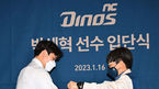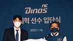 [OSEN=창원, 이석우 기자] 16일 오전 창원NC파크에서 NC 다이노스 박세혁의 입단식이 열렸다.박세혁은 지난해 11월 NC 다이노스와 계약 기간 4년, 계약 총액 46억원(계약금 18억원, 연봉 총 24억원, 인센티브 4억원)에 FA 계약했다.NC 박세