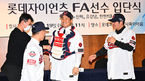 [OSEN=부산, 이석우 기자] 19일 오전 롯데호텔부산에서 롯데 자이언츠 노진혁, 유강남, 한현희의 입단식이 열렸다.노진혁, 유강남, 한현희가 롯데 유니폼을 입고 안치홍 등 선수들에게 축하 꽃다발을 받고 있다. / foto0307@osen.co.kr