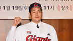[OSEN=부산, 이석우 기자] 19일 오전 롯데호텔부산에서 롯데 자이언츠 노진혁, 유강남, 한현희의 입단식이 열렸다.유강남이 롯데 유니폼을 입고 기자들의 질문에 답하고 있다. / foto0307@osen.co.kr