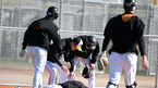 [OSEN=메사(미국 애리조나주), 지형준 기자] 11일(한국시간) 미국 애리조나주 메사에 위치한 벨 뱅크 파크에 스프링캠프를 차린 한화 이글스.한화 이원석이 훈련 도중 볼에 맞고 부상 상태를 살피고 있다. 2023.02.11 /jpnews@osen.co.kr