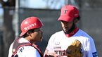 [OSEN=투손(미국 애리조나주), 지형준 기자] 15일(한국시간) 미국 애리조나주 투손 키노 스포츠 컴플렉스에서 열린 KIA 타이거즈 스프링캠프 훈련.KIA 메디나가 불펜 피칭을 마치고 김선우와 이야기 나누고 있다. 2023.02.15 /jpnews@osen.co