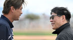 [OSEN=투손(미국 애리조나주), 지형준 기자] 이강철 감독이 이끄는 한국 야구대표팀이 21일(한국시간) 미국 애리조나주 투손 키노 스포츠컴플렉스에서 훈련을 가졌다.KBO 허구연 총재가 대표팀 김광현과 이야기를 나누고 있다. /jpne