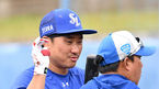 [OSEN=오키나와(일본), 이대선 기자] 27일 일본 오키나와 온나손 아카마 볼파크에서 삼성 라이온즈 스프링캠프가 진행됐다.삼성 강민호가 후배 이병헌을 격려하고 있다. 2023.02.27 /sunday@osen.co.kr