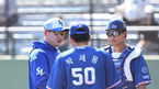 [OSEN=오키나와(일본), 이대선 기자] 삼성은 4일 일본 오키나와 나하의 셀룰러 스타디움에서 열린 2023 스프링캠프 연습경기 요미우리전에서 4-3으로 승리했다.9회초 삼성 박지만 감독이 마운드에 올라 투수를 교체하고 있다. 2023.03.