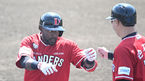 [OSEN=오키나와(일본), 이대선 기자] SSG는 6일 일본 오키나와 온나손 아카마 구장에서 열린 삼성 라이온즈와 연습경기에서 5-6으로 졌다.1회초 SSG 에레디아가 안타를 치고 손지환 코치와 하이파이브를 하고 있다. 2023.03.06 /sunday@osen.