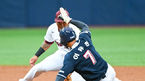 [OSEN=고척, 박준형 기자] 10일 서울 고척스카이돔에서 키움 히어로즈와 두산 베어스의 연습경기가 진행됐다.4회초 키움 러셀이 1루 주자 이유찬의 도루를 저지하고 있다. 2023.03.10 / soul1014@osen.co.kr