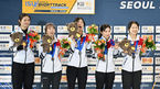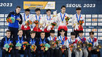 [OSEN=민경훈 기자] 12일 서울 목동 아이스링크에서 '2023 KB금융 국제빙상경기연맹(ISU) 쇼트트랙 세계선수권대회' 본선 경기가 진행됐다.남자계주 5,000m에서 금메달을 거둔 중국, 은메달을 거둔 이탈리아, 동메달 대한민국 선수들이