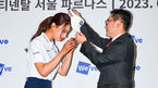 [OSEN=박준형 기자] 13일 오후 서울 삼성동 그랜드 인터컨티넨탈에서 두산건설 We’ve 골프단 창단식이 진행됐다. 골퍼 유현주와 박결, 유효주, 임희정, 김민솔이 첫시즌 함께한다.박결이 이정환 사장에게 모자를 전달받고 있다. 2