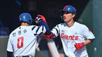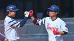 [OSEN=부산, 이석우 기자] 14일 부산 사직구장에서 2023 신한은행 SOL KBO리그 롯데 자이언츠와 두산 베어스의 시범경기가 열렸다. 롯데 자이언츠 노진혁이 3회말 무사 1,2루 우월 3점 홈런을 치고 하이파이브를 하고 있다. 2023.03.14 / fot