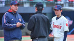[OSEN=부산, 이석우 기자] 15일 부산 사직구장에서 2023 신한은행 SOL KBO리그 롯데 자이언츠와 SSG 랜더스의 시범경기가 열렸다. 심판이 롯데 자이언츠 장세진의 킥에 대해 얘기하고 있다. 2023.03.15 / foto0307@osen.co.kr