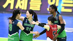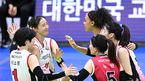 [OSEN=수원, 이대선 기자] 16일 오후 경기도 수원체육관에서 ‘2022~23 도드람 V리그’ 여자부 현대건설과 KGC인삼공사의 경기가 열렸다.3세트 득점에 성공한 KGC인삼공사 선수들이 환호하고 있다. 2023.03.16 / sunday@osen.co.kr