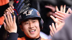 [OSEN=대전, 조은정 기자]18일 대전 한화생명이글스파크에서 '2023 KBO리그 시범경기' 한화-키움의경기가 열렸다.4회말 1사 2루 한화 노수광의 적시타에 박정현이 득점을 올린 뒤 기뻐하고 있다. 2023.03.18 /cej@osen.co.kr