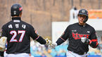 [OSEN=대전, 조은정 기자]18일 대전 한화생명이글스파크에서 '2023 KBO리그 시범경기' 한화-키움의 경기를 앞두고 훈련이 진행됐다.4회말 무사 2,3루 한화 노시환의 2타점 적시타에 노시환이 역전 득점을 올리고 있다. 2023.03.18 /cej@osen.