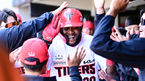 [OSEN=광주, 조은정 기자] 19일 광주 기아챔피언스필드에서 2023 KBO리그 두산 베어스와 KIA 타이거즈의 시범경기가 열렸다.6회말 KIA 선두타자 소크라테스가 달아나는 우월 홈런을 날린 뒤 더그아웃에서 축하를 받고 있다.2023.03.19 /cej