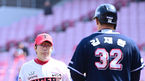 [OSEN=광주, 조은정 기자] 19일 광주 기아챔피언스필드에서 2023 KBO리그 두산 베어스와 KIA 타이거즈의 시범경기가 열렸다.2회초 이닝을 마친 KIA 양현종이 두산 김재환과 대화를 나누고 있다. 2023.03.19 /cej@osen.co.kr