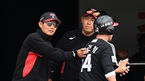 [OSEN=수원, 이대선 기자] 23일 수원 KT위즈파크에서 2023 신한은행 SOL KBO리그 시범경기 KT 위즈와 LG 트윈스의 경기가 열렸다. 5회초 무사 2,3루에서 LG 오스틴의 적시타 때 홈을 밟은 서건창이 더그아웃에서 염경엽 감독의 축하를 받
