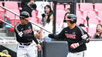 [OSEN=수원, 이대선 기자] 23일 수원 KT위즈파크에서 2023 신한은행 SOL KBO리그 시범경기 KT 위즈와 LG 트윈스의 경기가 열렸다. 3회초 무사에서 LG 김기연이 좌월 솔로 홈런을 치고 김민호 코치와 하이파이브를 하고 있다. 2023.03.23 /sund