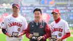[OSEN=고척, 박준형 기자] 1일 오후 서울 구로구 고척스카이돔에서 ‘2023 신한은행 SOL KBO리그’ 키움 히어로즈와 한화 이글스의 개막전이 진행됐다. 경기 앞서 양팀 감독과 정우람, 이정후가 포즈를 취하고 있다. 2023.04.01 / soul1014@o