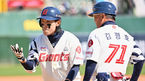 [OSEN=잠실, 민경훈 기자] 9일 오후 서울 잠실야구장에서 ‘2023 신한은행 SOL KBO리그’ LG 트윈스와 삼성 라이온즈의 경기가 열렸다.2회말 1사 주자 만루 LG 정주현이 중견수 희생플라이로 1타점을 올리고 있다. 2023.04.09 /rumi@osen.co.kr