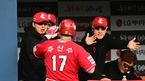 [OSEN=잠실, 지형준 기자] 27일 오후 서울 잠실야구장에서 ‘2023 신한은행 SOL KBO리그’ LG 트윈스와 SSG 랜더스의 경기가 열렸다.1회초 무사 1루에서 SSG 추신수가 최지훈의 선제 적시타에 홈을 밟고 김원형 감독, 조원우 코치와 기뻐