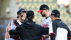 [OSEN=잠실, 지형준 기자] 27일 오후 서울 잠실야구장에서 ‘2023 신한은행 SOL KBO리그’ LG 트윈스와 SSG 랜더스의 경기가 열렸다.1회초 무사 1,3루에서 LG 김경태 코치가 마운드에 올라 박동원, 플러코를 격려하고 있다. 2023.04.27 /jpnews