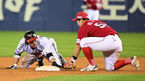 [OSEN=잠실, 지형준 기자] 27일 오후 서울 잠실야구장에서 ‘2023 신한은행 SOL KBO리그’ LG 트윈스와 SSG 랜더스의 경기가 열렸다.7회말 1사 1루에서 LG 서건창이 SSG 최주환의 태그에 앞서 2루 도루에 성공하고 있다. 2023.04.27 /jpnews@osen.c