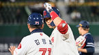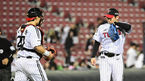 [OSEN=잠실, 조은정 기자] 11일 오후 서울 잠실야구장에서 ‘2023 신한은행 SOL KBO리그’ LG 트윈스와 키움 히어로즈의 경기가 열렸다.9회초 1사 LG 3루수 문보경이 키움 이형종의 타구를 호수비로 처리하자 투수 박명근이 기뻐하고