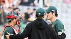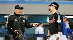 [OSEN=인천, 민경훈 기자] 12일 오후 인천 SSG랜더스필드에서 ‘2023 신한은행 SOL KBO리그’ SSG 랜더스와 한화 이글스의 경기가 열렸다.1회초 1사 주자 1루 한화 이진영 타석에서 SSG 조웅천 투수코치가 마운드에 올라 선발 박종훈과