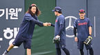 [OSEN=부산, 이석우 기자] 24일 부산 사직구장에서 2023 신한은행 SOL KBO리그 롯데 자이언츠와 NC 다이노스의 경기가 열린다. 롯데 자이언츠에 영입된 두산 베어스 출신 국해성이 사직야구장에서 훈련 도중 김원중의 축하를 받고 있